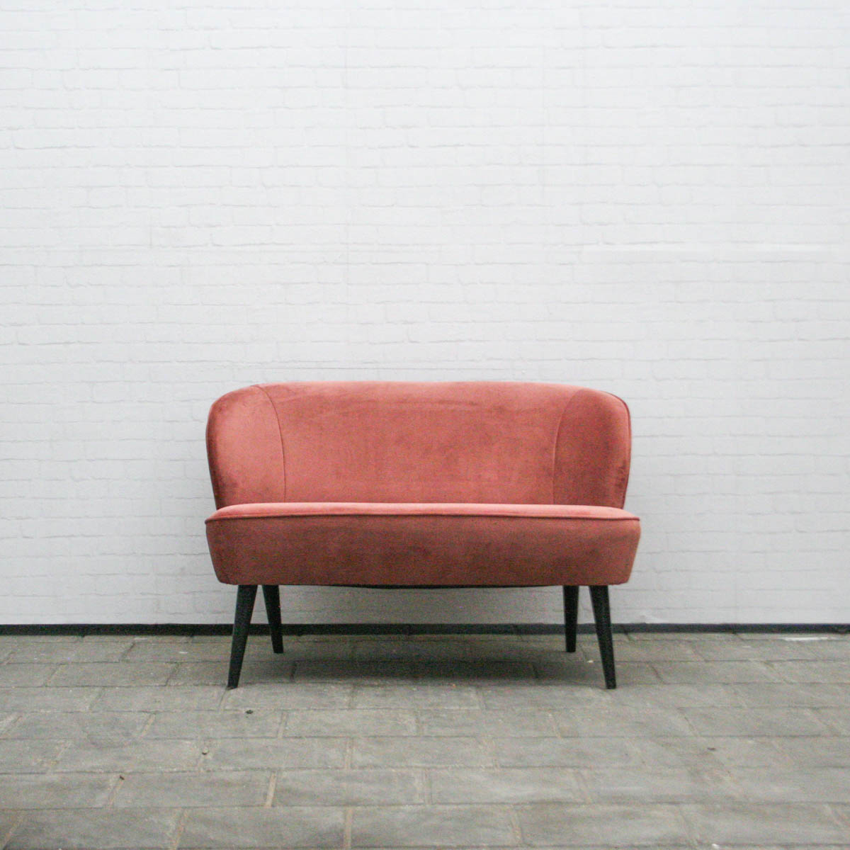 Een velvet bankje met een oud roze kleur.