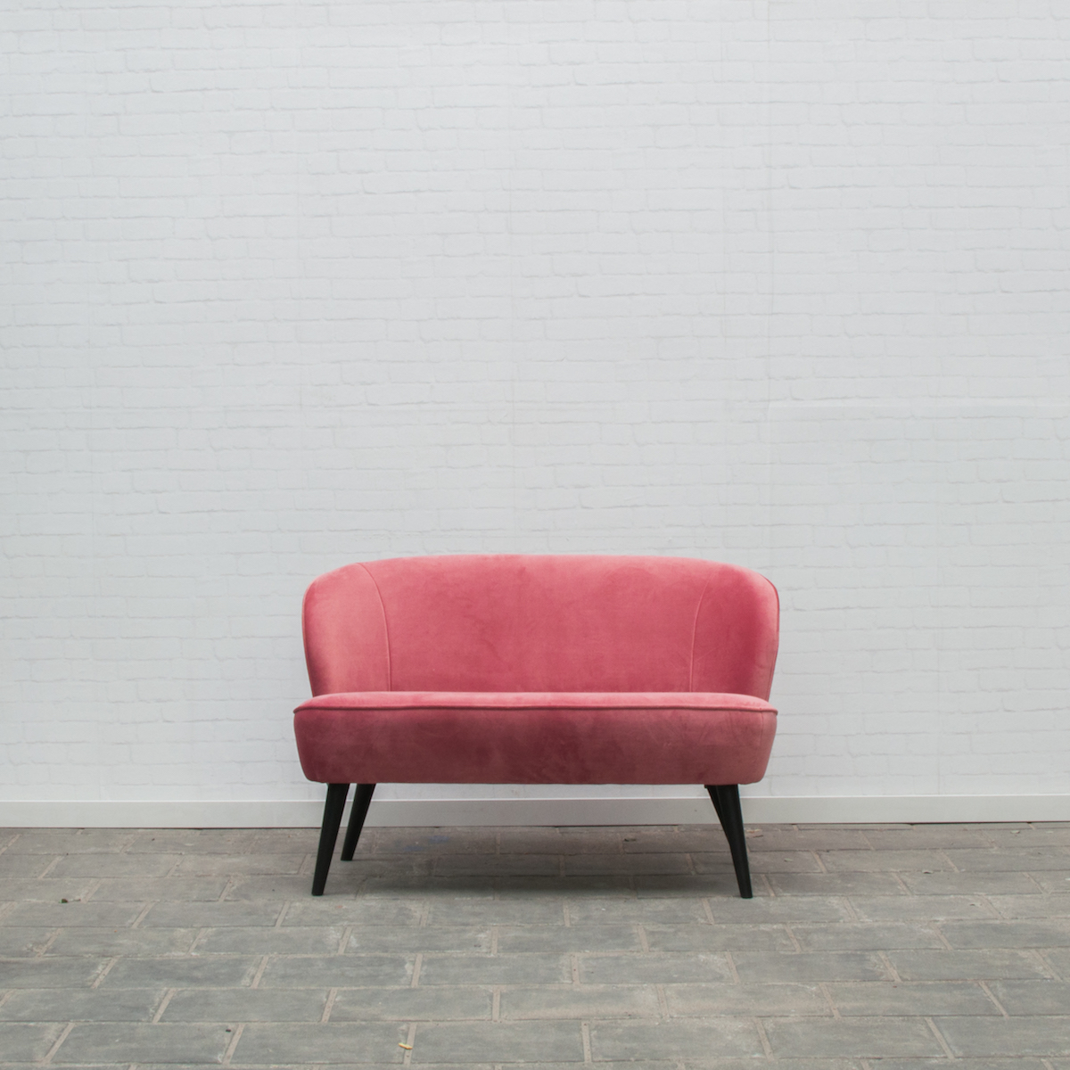Een velvet bankje met een roze kleur.