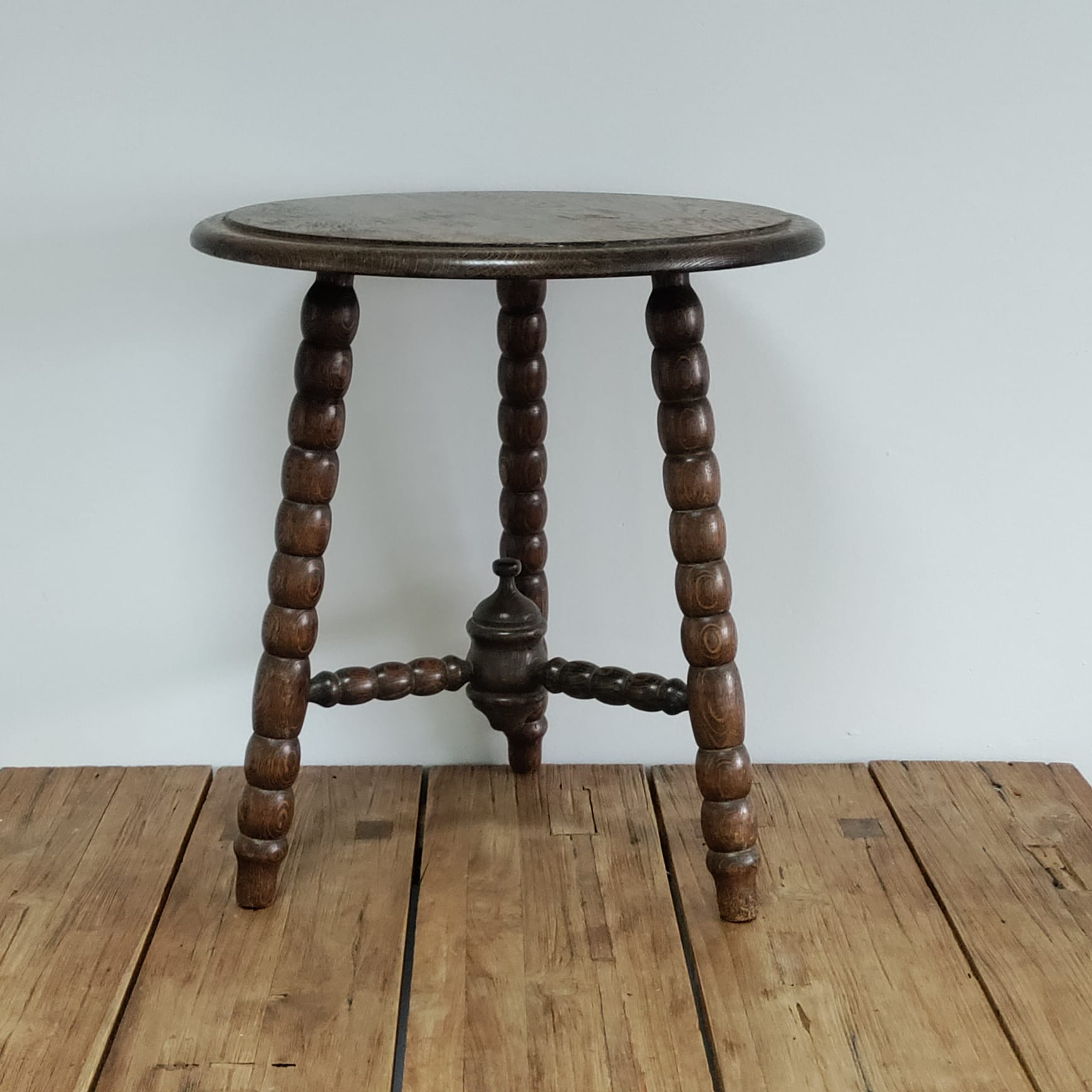 Een ronde houten bijzettafel.