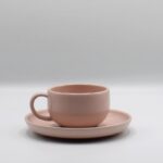 Roze kopje met bijpassend schoteltje. Dit servies bestaat uit meerdere borden en schaaltjes.