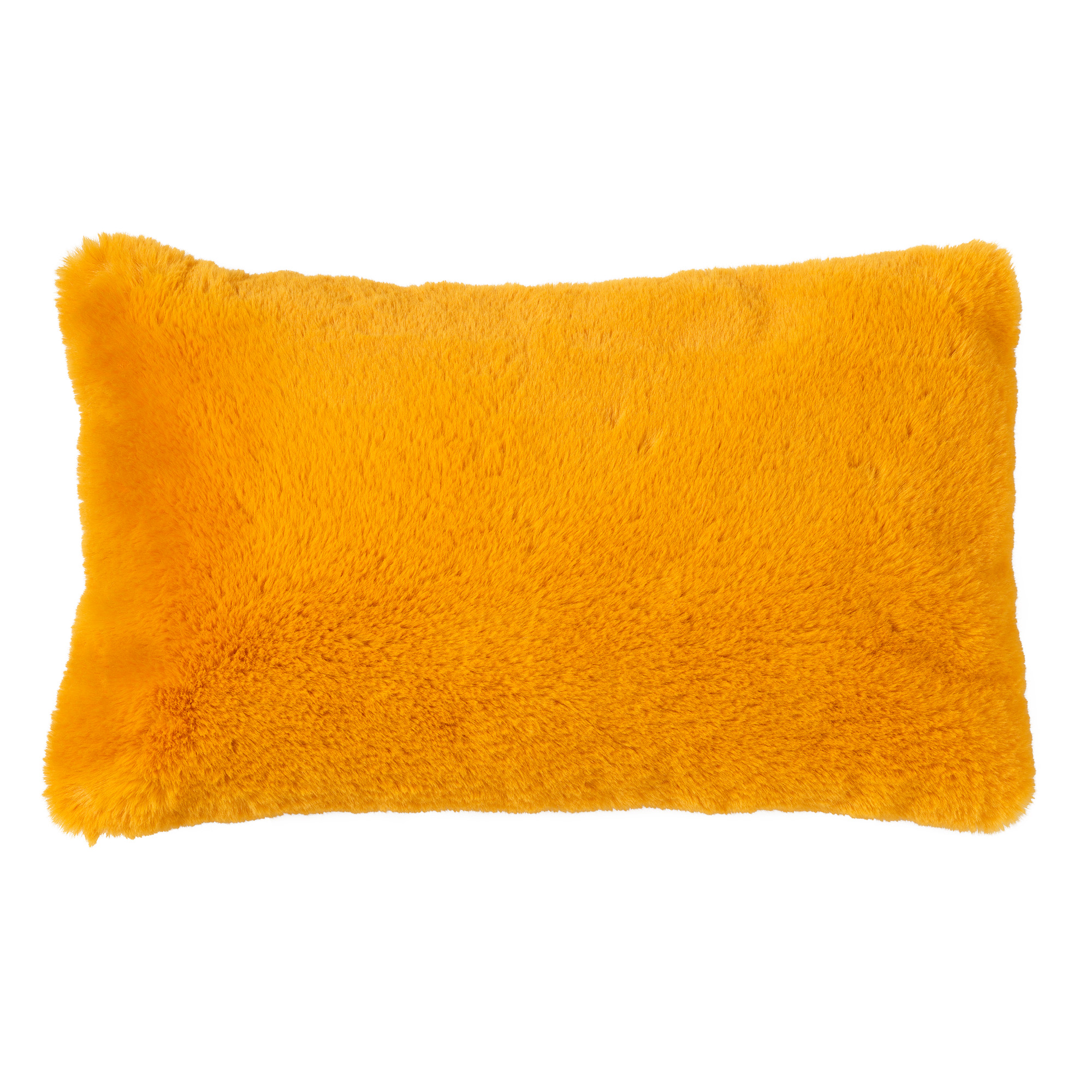 Een langwerpig fluffy kussen in de kleur geel.