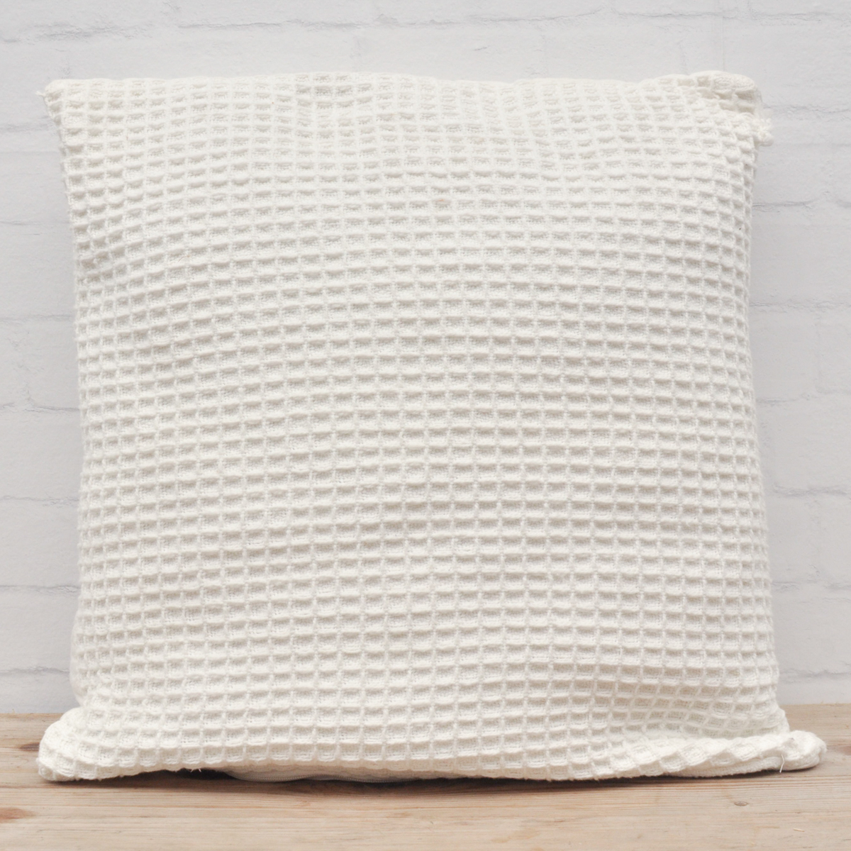 Een wit kussen met een leuk wafel patroontje.