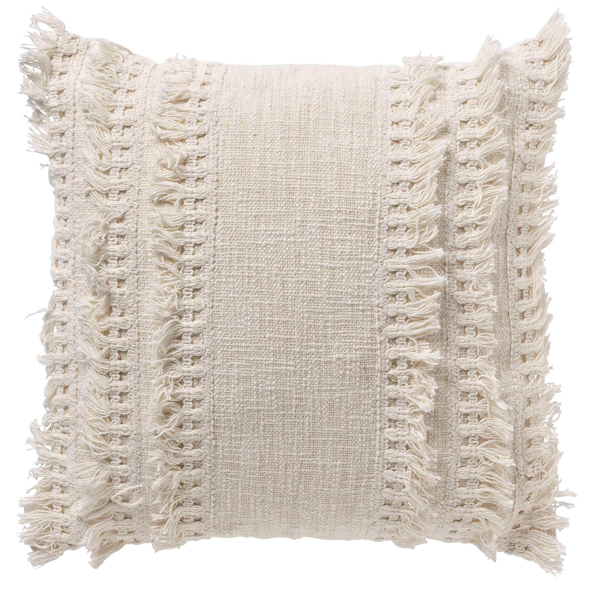 Een wit kussen met leuke franjes.