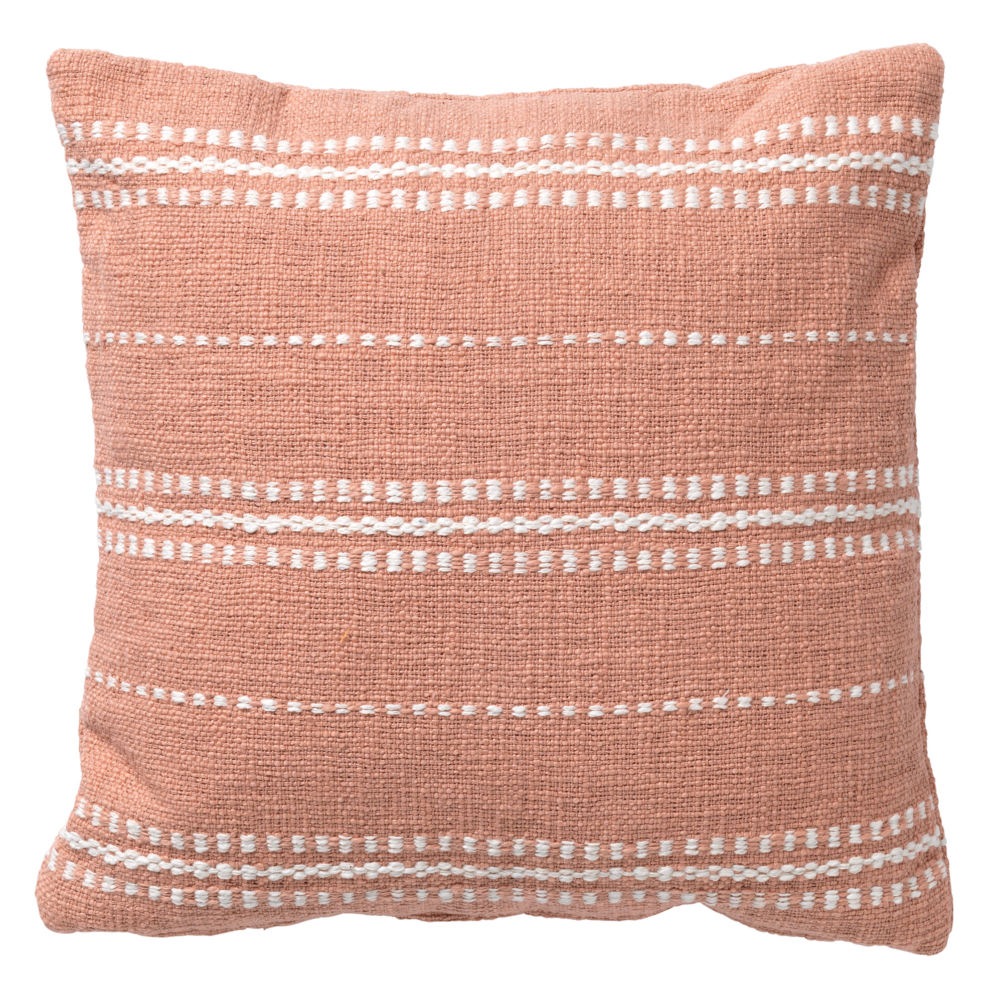 Een zalmkleurig kussen met leuke borduursels.