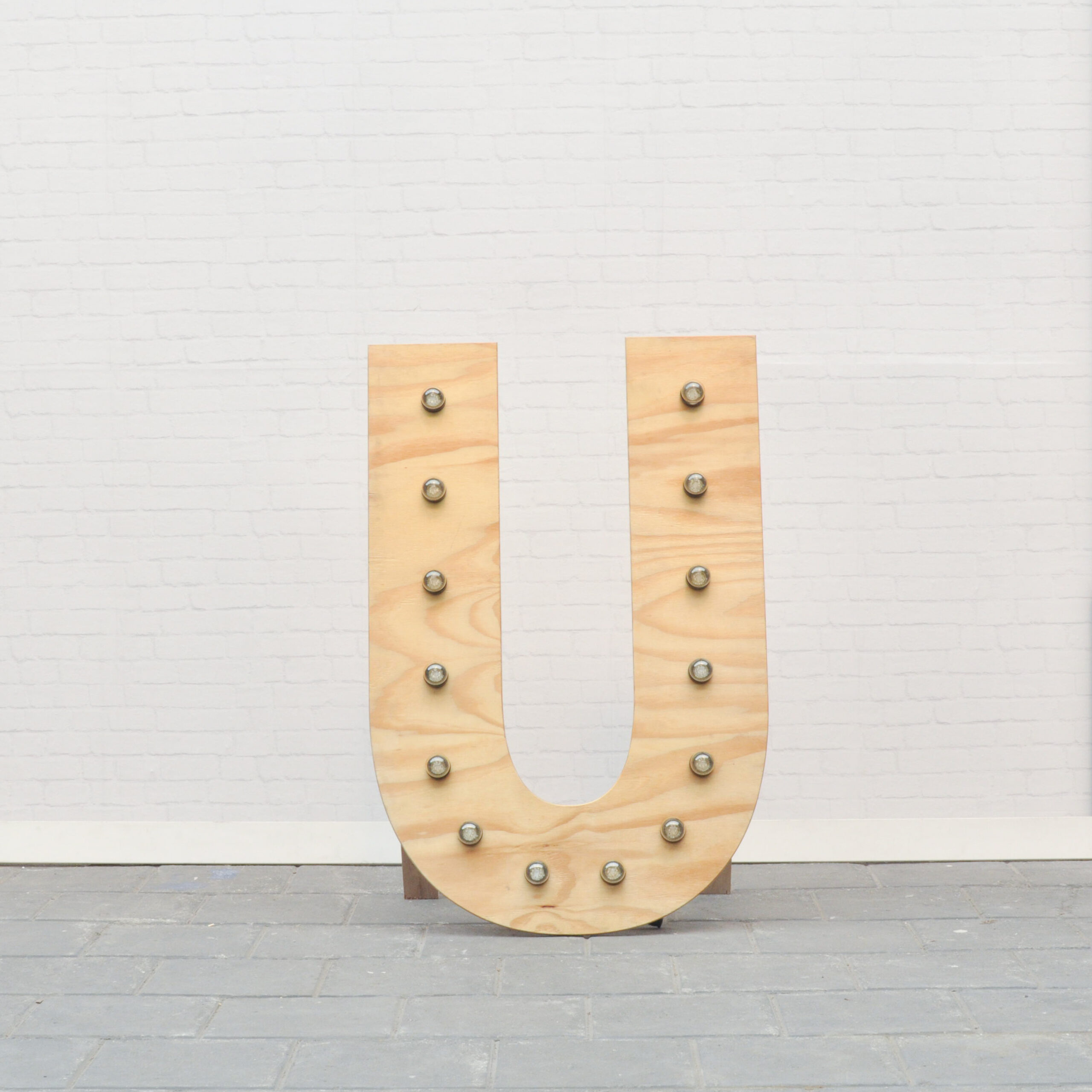 De lichtletter U, circa 60 cm hoog. Ook in een groter formaat beschikbaar.