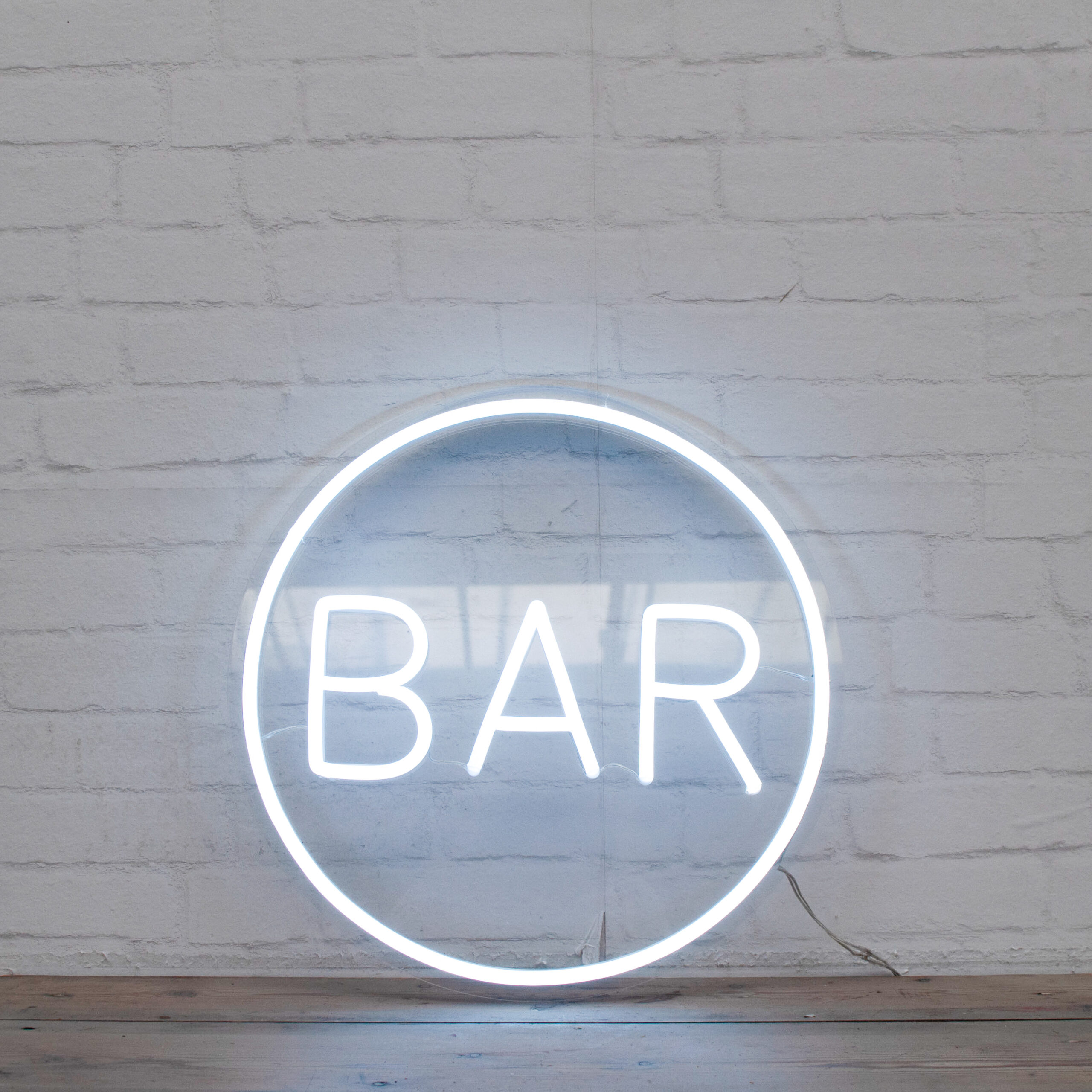 Neon sign Bar. Gemakkelijk aan te sluiten met een normale stekker. Kabelafstand naar transformator 2 meter. (Let op, er zit een transformator kastje bij). Stekker 1 meter. Het Neon sign is voorzien van een voetje waardoor hij zelfstandig kan staan.