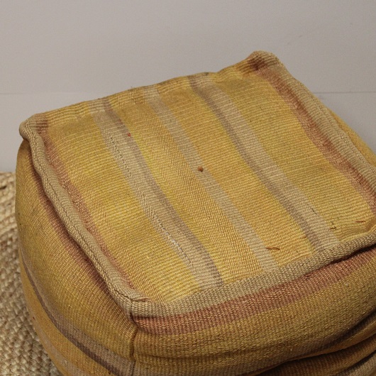 Een geel gestreepte vierkante poef.