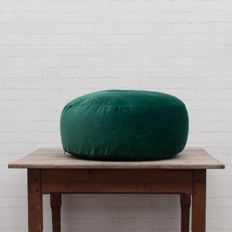 Een knalgroene poef met een velvet stof.