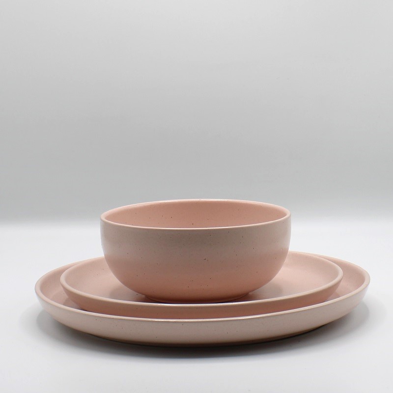 Roze schaaltje. Dit servies bestaat uit meerdere borden en schaaltjes.